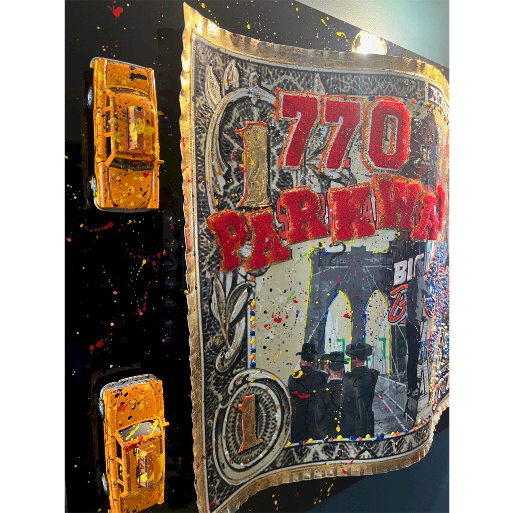 - Made of twisted aluminium - Golden leafs - Painting 3D - Panel under the dollar with nyc cabs - Cable at the back ready to hang up - Certificate of origin