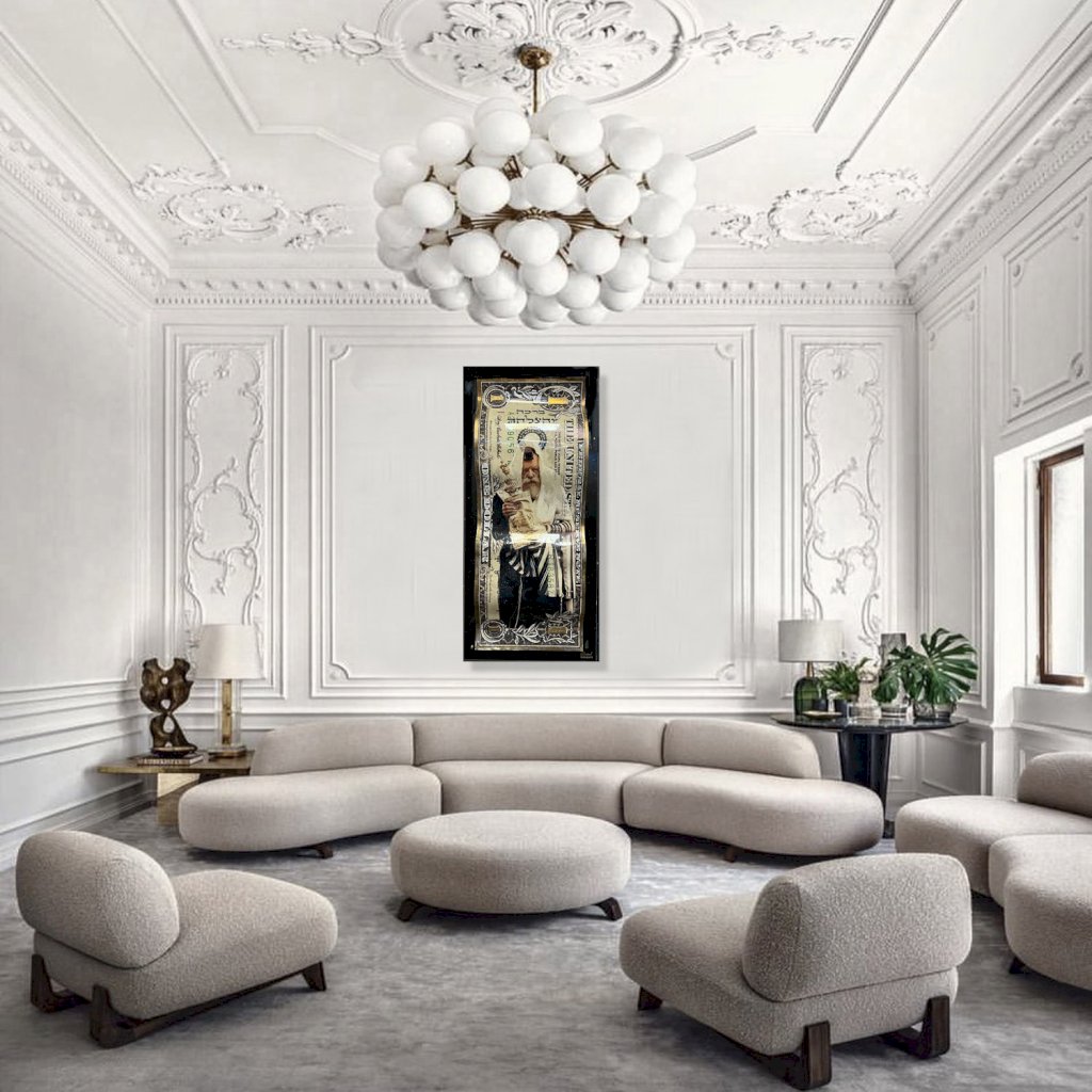 - Réalisé en aluminium ondulé - Patine à la feuille d'or - Peinture relief - Plaque sous le dollar - Cable d'accroche au dos du dollar - Certificat d'authenticité